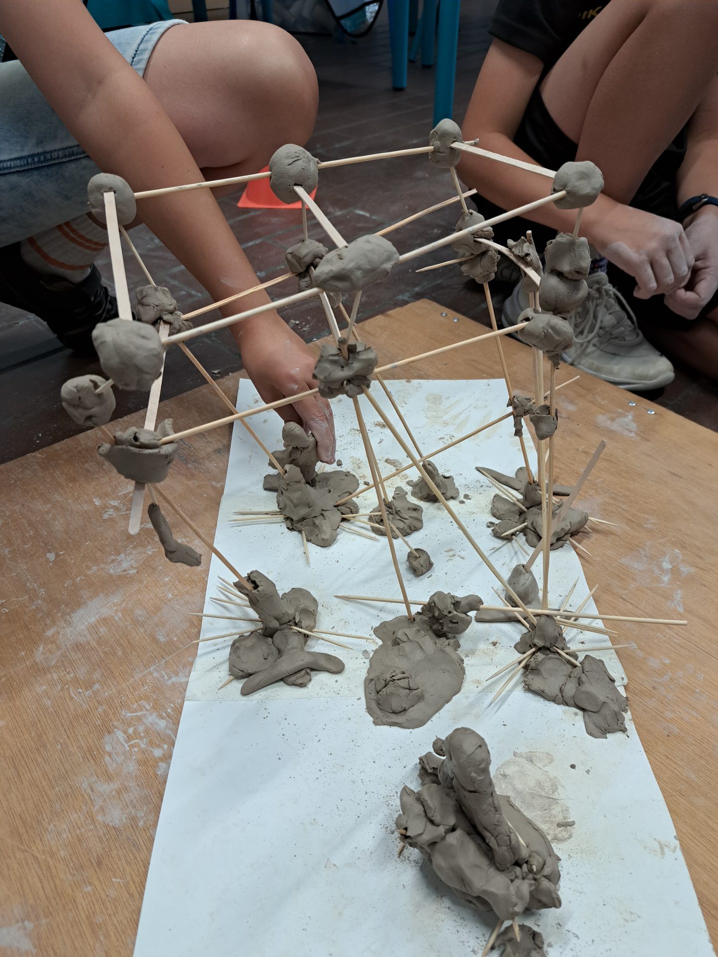 - Gelieve ook een borstel en vuilblik (+ vuilbak voor papier en restafval) te voorzien om na de workshop alles bij elkaar te vegen. Er wordt onvermijdelijk gemorst op de grond, maar alles is perfect afwasbaar (klei en water).